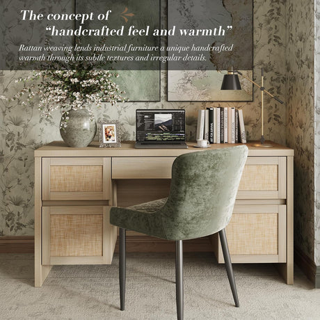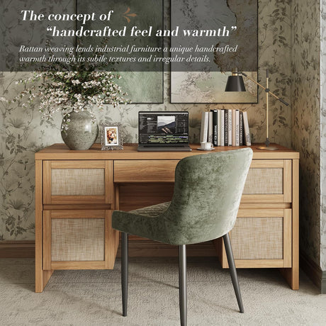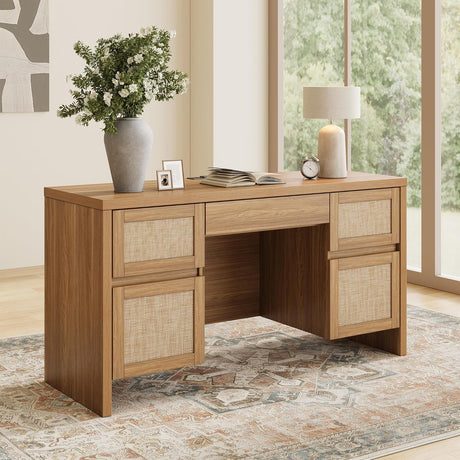 Yechen 57" Modern Rattan Executive Desk with 5 Drawers