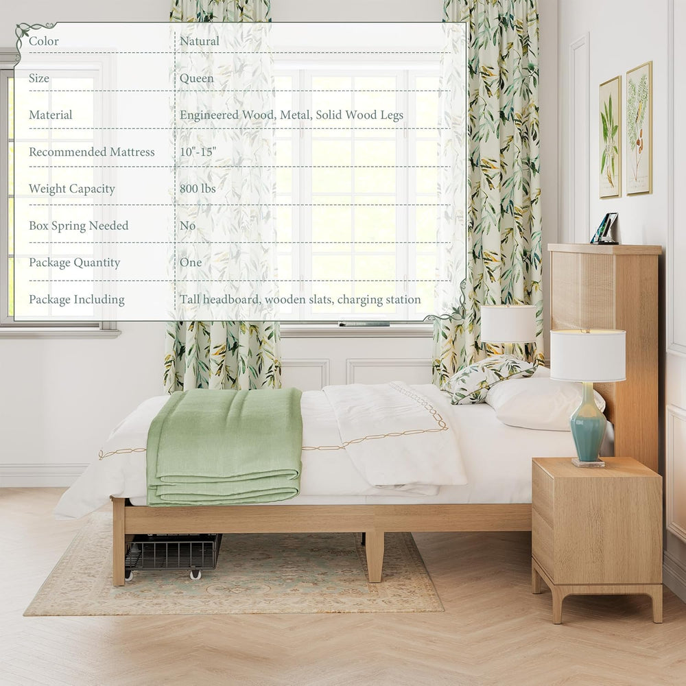 This queen bed combines eco-friendly, durable MDF wood with a sturdy iron-wood frame, supporting up to 800 lbs. Its 55" high fluted headboard offers comfort, while two storage drawers keep essentials tidy. The retro-chic design features a wood-grain finish and modern lines. Enhanced with a built-in charging station (2 AC sockets, 1 USB-C, 1 USB-A) and noise-reducing strips, it ensures convenience and stability. Includes an installation video and professional support.