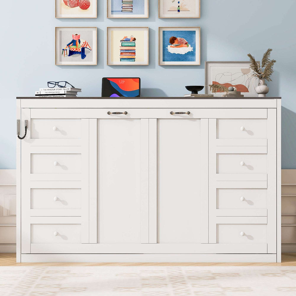 [Space-Saving Murphy Bed] The twin horizontal Murphy bed folds neatly into a compact cabinet, freeing up valuable floor space. When folded, it transforms into a stylish retro cabinet with decorative drawer fronts that blend into any décor.