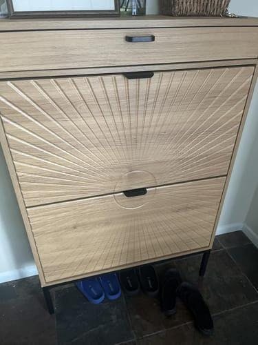 Slim Entryway Shoe Organizer with Half-Circle Doors - Natural / Sun pattern is backordered and will ship as soon as it is back in stock.