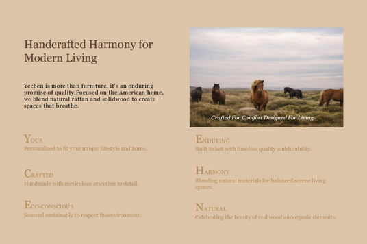 Yechen is more than furniture,it's an enduring promise of quality. Focused on the American home,weblend natural rattan and solidwood to create spaces that breathe. Our custom wood furniture is handcrafted in Yechen workshops with solid vietnam hardwoods.
