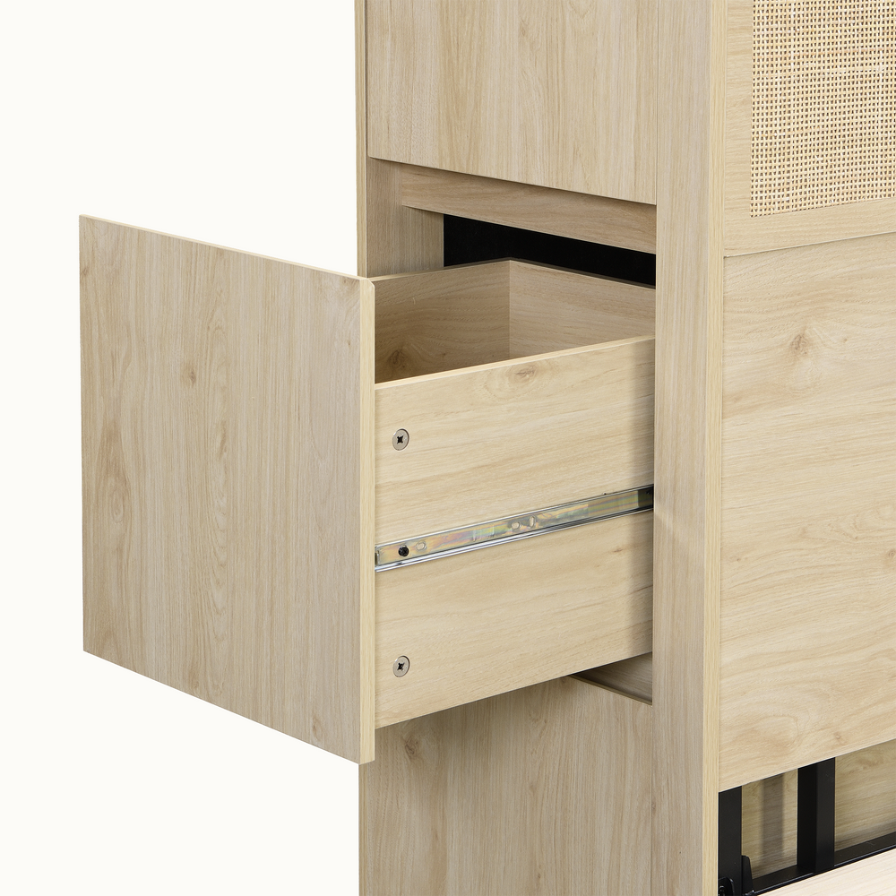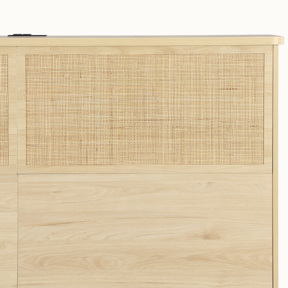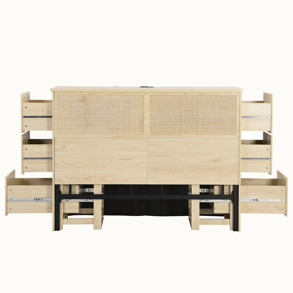 Boho Rattan Queen Bed Frame with Charging Station & 10 Storage Drawers