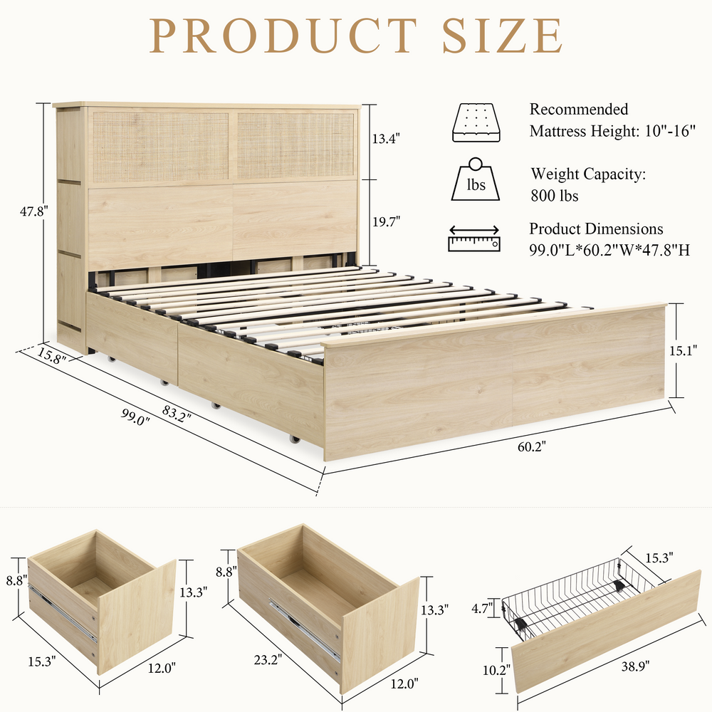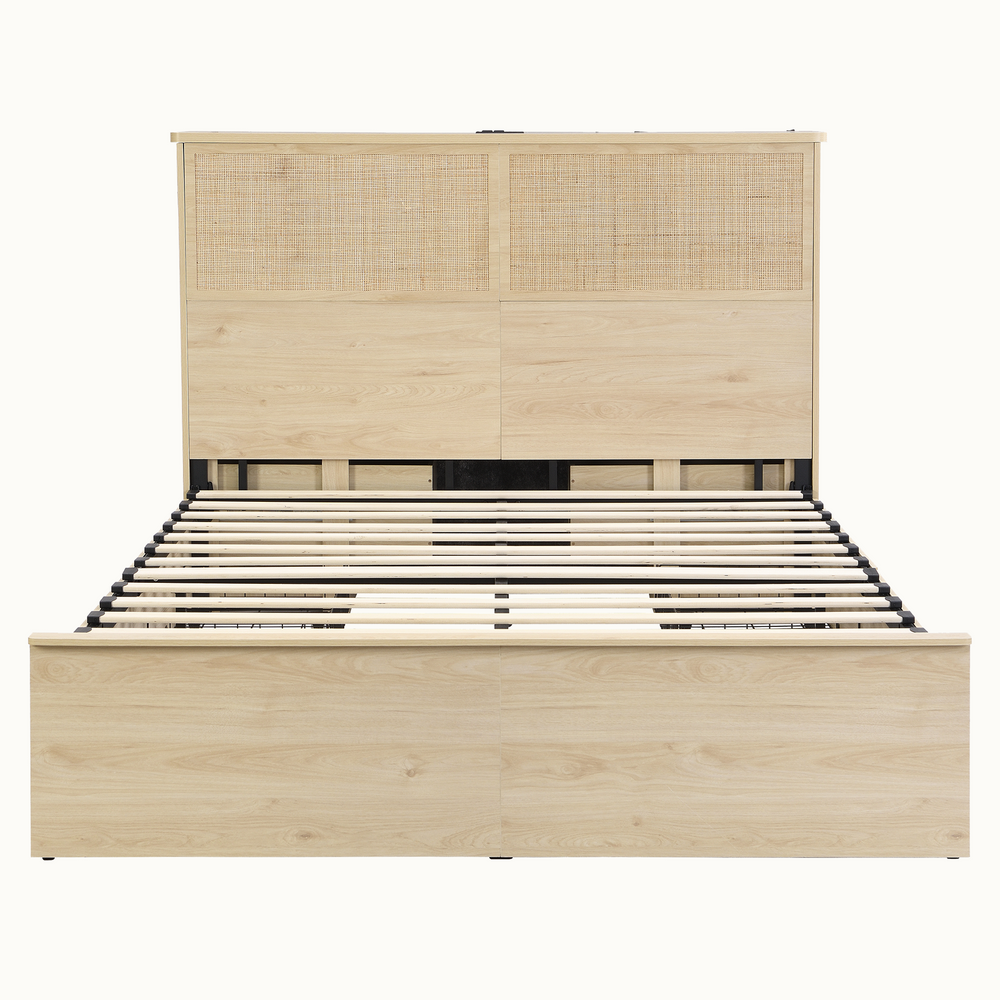 Boho Rattan Queen Bed Frame with Charging Station Headboard & 10 Storage Drawers