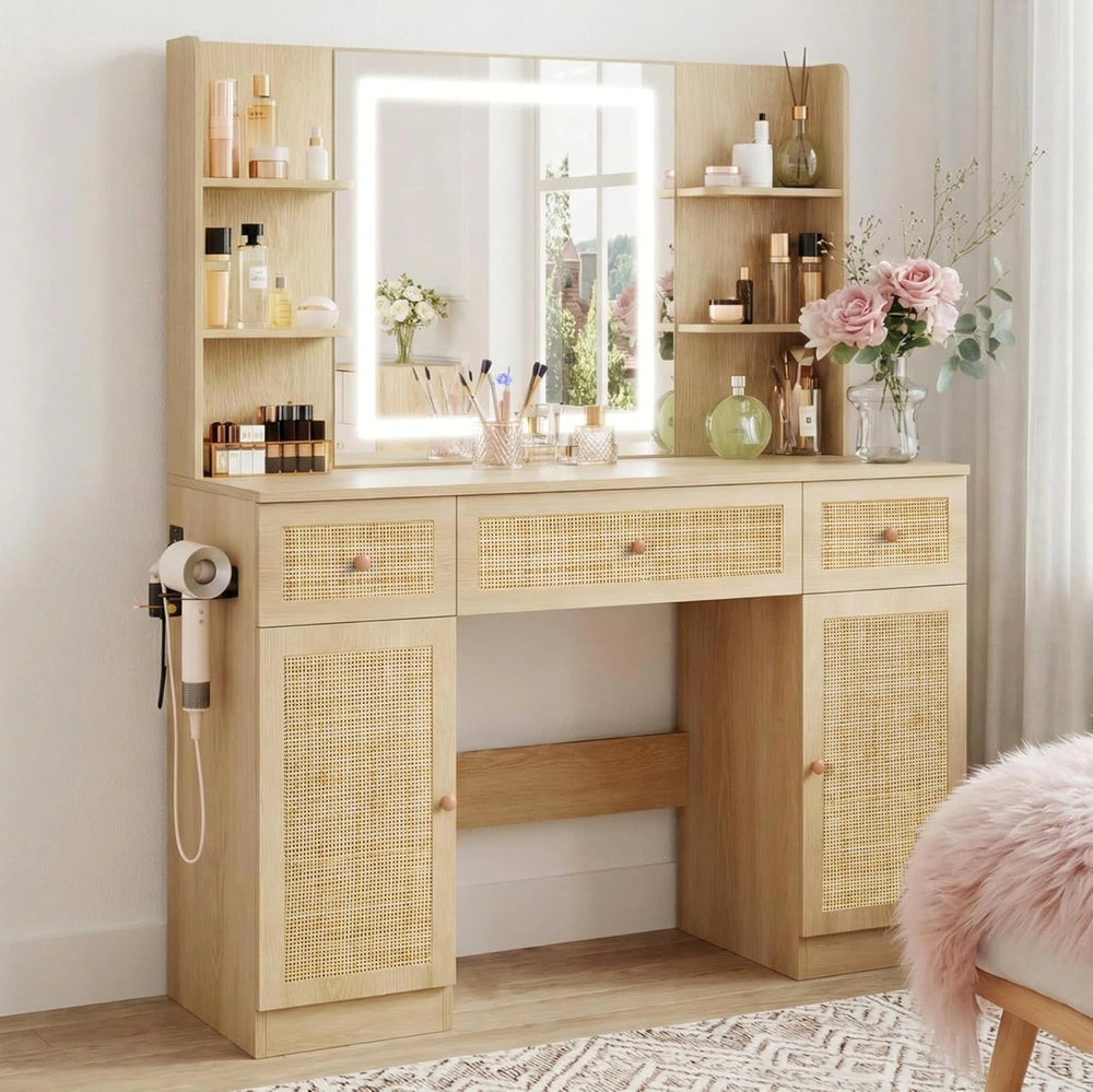 Your Dream Beauty Sanctuary. Blending organic textures with modern technology, the Yechen Boho Vanity brings a coastal, breezy vibe to your bedroom. This isn't just a desk—it's a curated space designed to organize your beauty essentials while charging your life. With its signature rattan drawer fronts and hidden storage, it’s the perfect mix of "chic" and "smart."