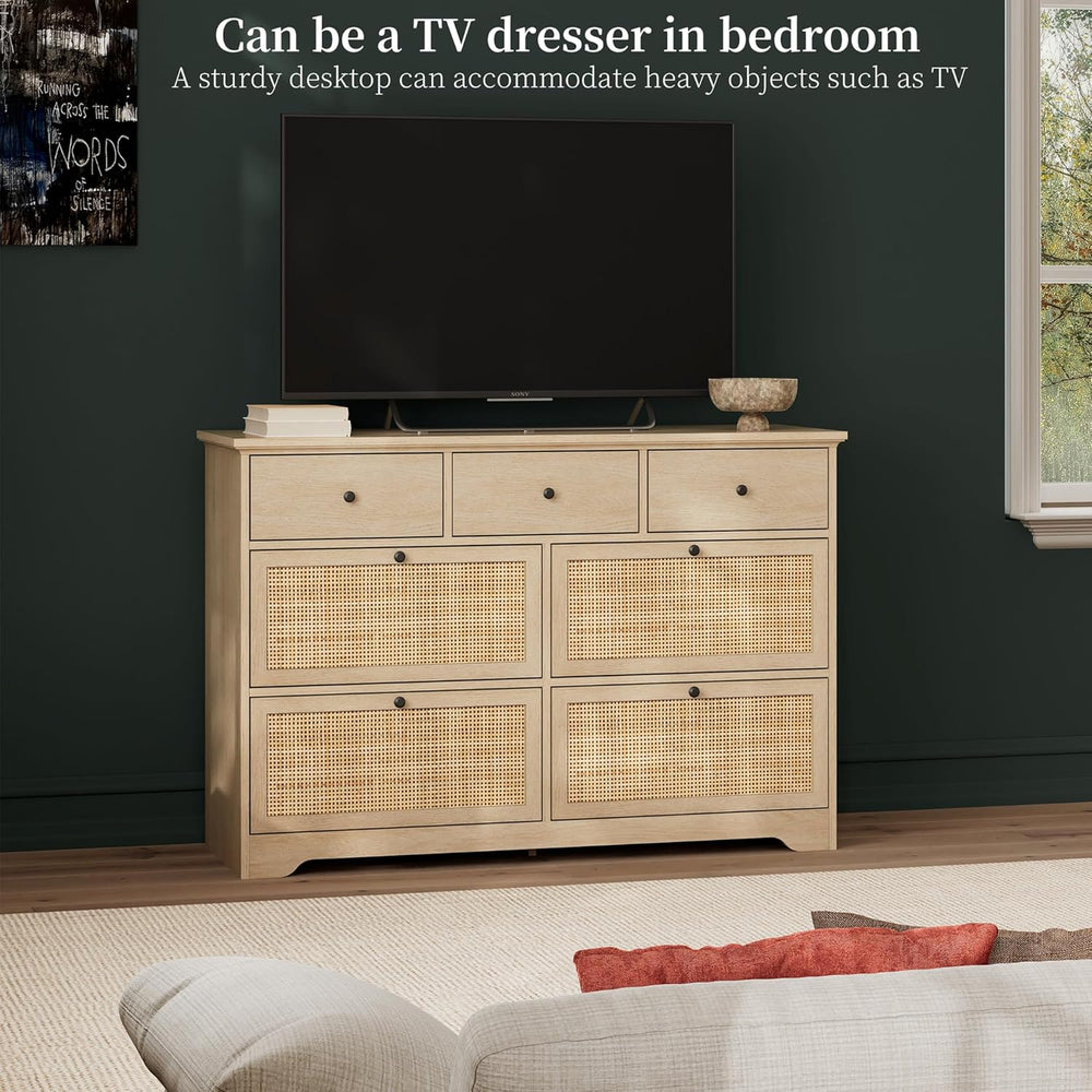 Yechen 47.2'' Wide Rattan Dresser - 7 Drawer Mid-Century Natural Wood Storage Cabinet