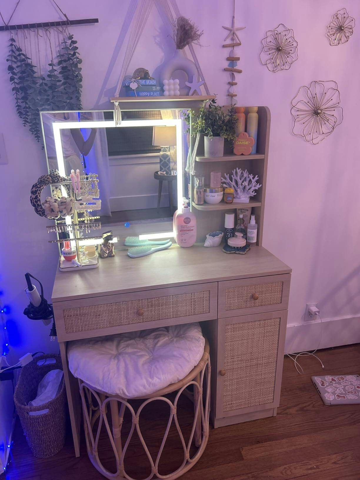 Yechen Home 35" Smart Vanity Desk Set with 3-Color LED Mirror, Power Outlet & Padded Stool - Natural is backordered and will ship as soon as it is back in stock.
