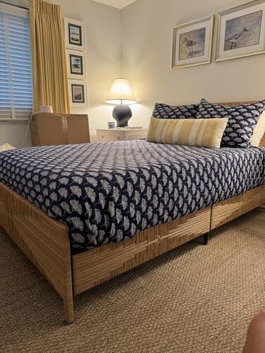 Transform your bedroom into a serene bohemian sanctuary with this exquisite handcrafted rattan queen bed frame. Featuring intricate hand-woven rattan panels, a tall headboard and footboard, and heavy-duty steel construction supporting up to 1,000 lbs, this mid-century modern bed combines vintage charm with exceptional durability.